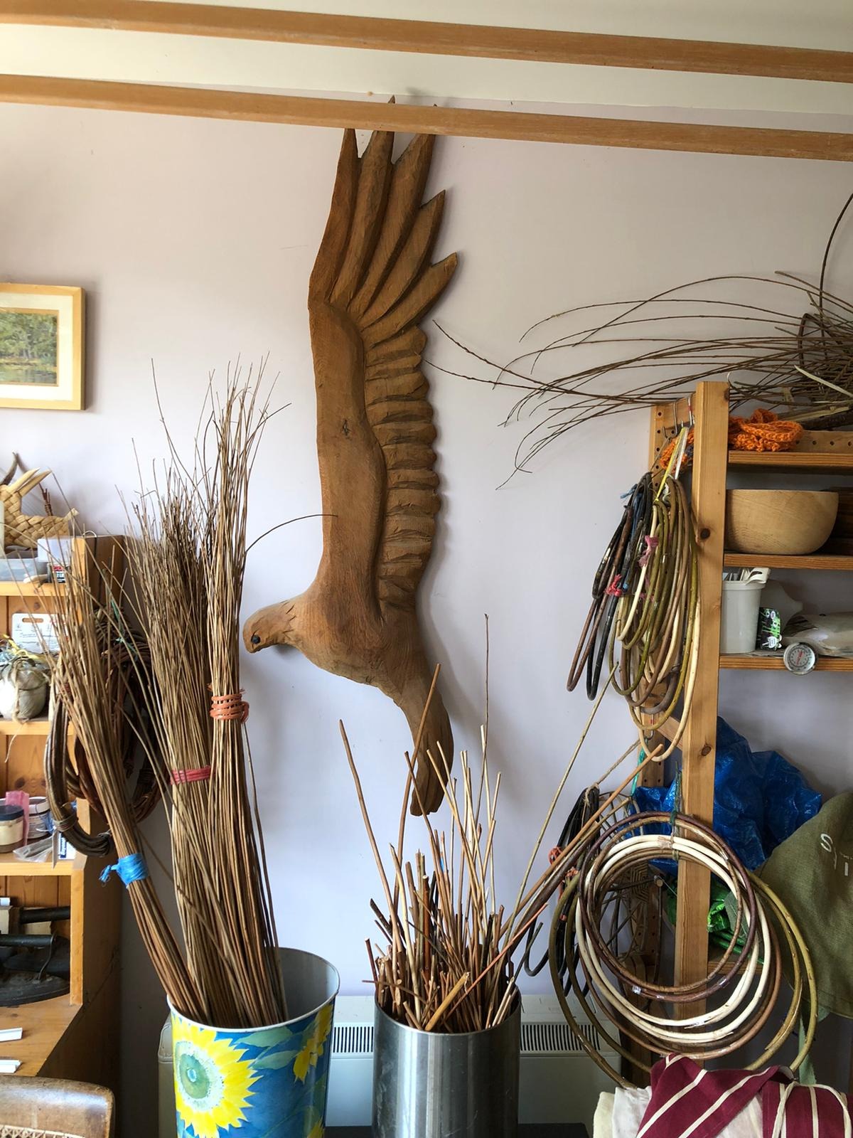 We had entered Charlotte and Michael's house through the basket-making workshop and were surrounded by willow rods in all shapes and length, half-made baskets, pieces of twisted wood (for basket handles?), and carvings on the walls.