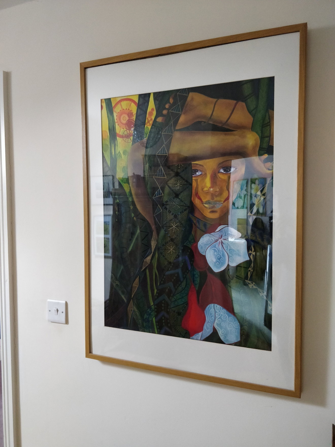 Elidh's house in Whittingham is full of beautiful and interesting artefacts from all over the world. Art by her, and others, cover the walls. She and her husband, Derek, settled here upon returning to the North East after 3 years working in Fiji. What catches my eye the most is an intriguing figure of a Gauginesque girl, crying tears of blood, which turn into bell-shaped, voluptuous flowers. Elidh tells me “There are several versions of the story which inspired this painting. In one, a disobedient girl runs away from her angry mother. Climbing into a tree she becomes entangled in the vines. In another version, she is running from an arranged marriage.” Elidh, whose work is suffused with hints of legends and myths, was reminded of European folk tales of children running away. In Elidh's painting, trees and plants, patterned with symbols, snake around the girl. As with all her work, the surface may look pretty, but there are deep and thoughtful layers. For instance, the pose of the girl is taken directly from a UNICEF article on female genital mutilation.